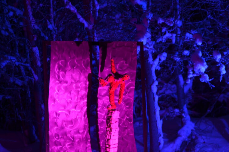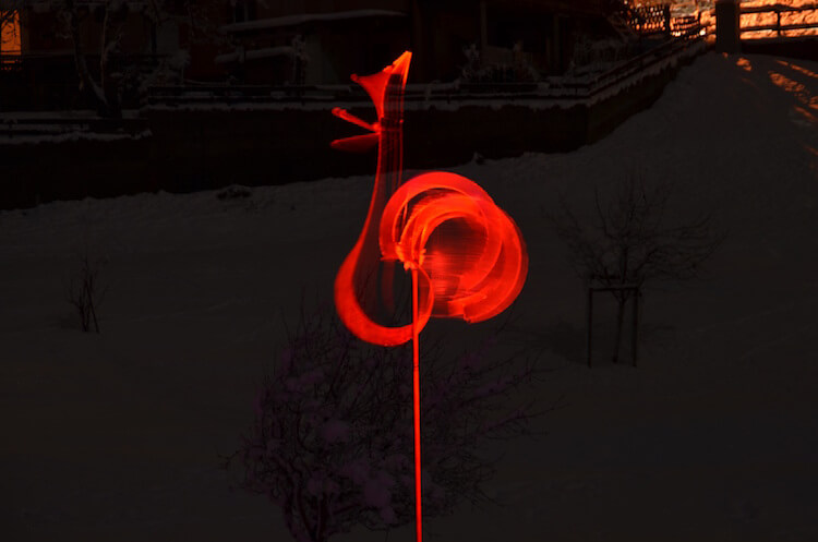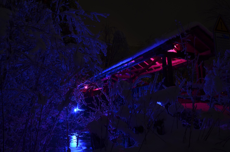 Samstag, 5. Januar 2019, 18 Uhr, Alvaneu Bad. Schneefall, klirrende Kälte. Zahlreiche Einheimische und Gäste, die bei einem lodernden Feuer in Empfang genommen und zur Begrüssung auf die alte Albula-Brücke geführt werden. Thomas Kollegger, Präsident des Vereins führt aus: „Mit unserem Projekt WASSERLICHT gehen wir zurück zu den natürlichen Sichtweisen. Energie tanken lassen, heisst für uns, Ihnen das Wenige zu bieten, nicht mehr, eher weniger.“ Andreas Oberli, der zusammen mit Roman Platz für die künstlerische Umsetzung verantwortlich zeichnet, betont während der Führung: „Nicht nur der Mensch schafft Kunst, auch und vor allem die Natur selber. Der Mensch mit seinen (Kunst-)Werken ist hier Mittel zum Zweck. WASSERLICHT hebt die aus der Natur entstandenen Kunstwerke (Rauhreif, Eis, Eiszapfen, Wasserlauf) mit subtilem Licht, zum Teil farbwechselnd, hervor und ergänzt sie mit vom Mensch geschaffener Kunst.“