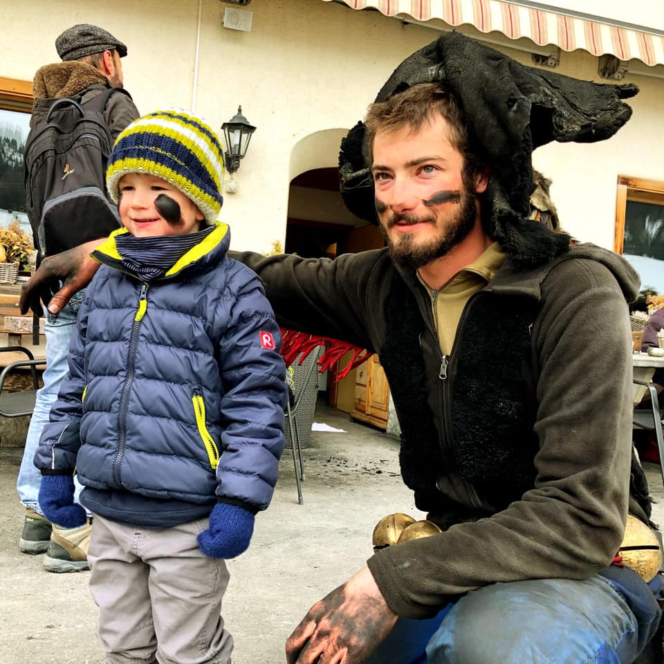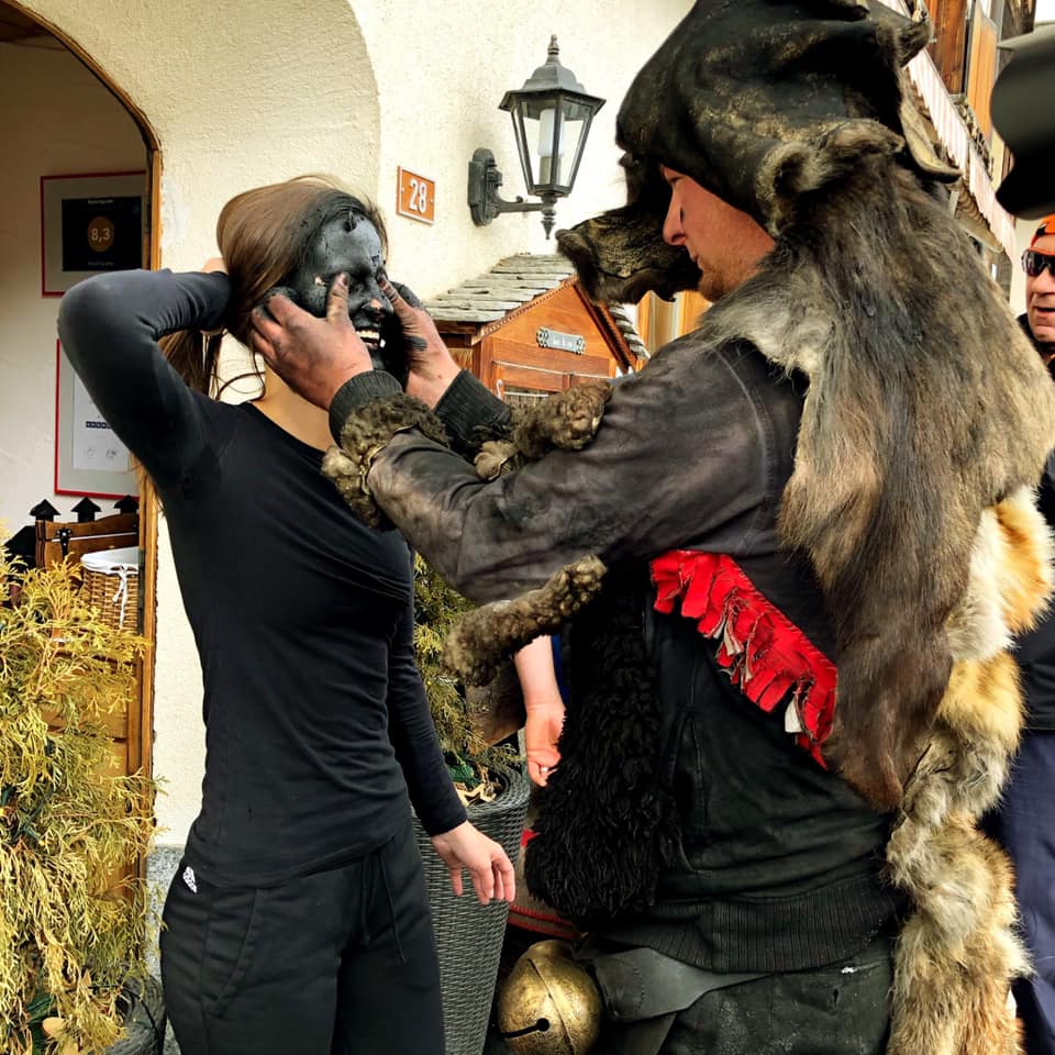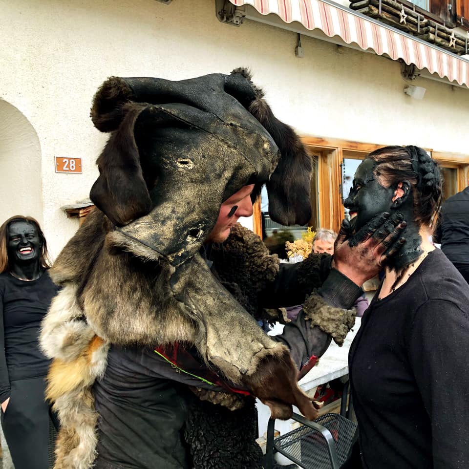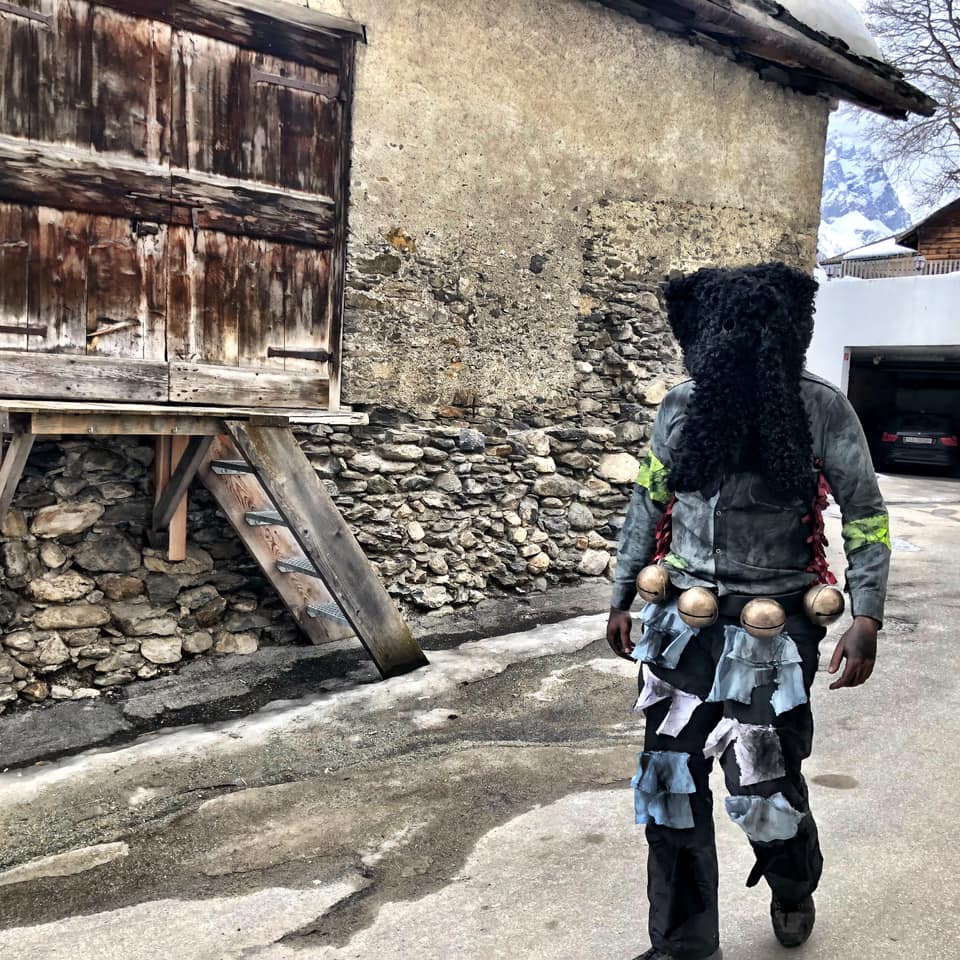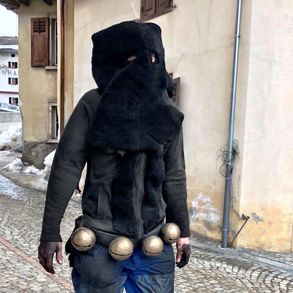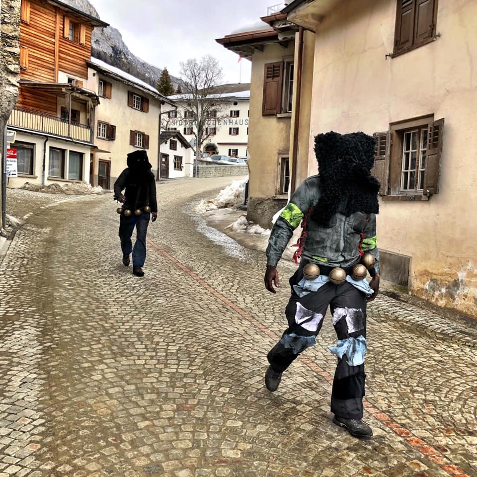 In Fell bekleidet und mit Glocken um die Hüften ziehen die «Pschuurirollis» am Aschermittwoch durch das Rheinwälder Dorf Splügen. Hier einige Impressionen im Dorfkern vor dem Hotel Suretta.