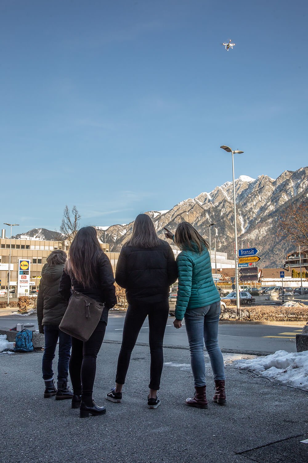 Als nächstes stand ein Drohnenflug über das Hauptgebäude der HTW Chur an, um dessen Position von oben zu filmen. Die Drohne wird heutzutage in der Forschung vielseitig eingesetzt. Versuchsflächen können von oben aufgenommen werden, beispielsweise werden Rissbildung auf dem Eis verfolgt, oder in schwer zugänglichem Gelände kann ein Steinschlagschutznetz überprüft oder Lawinenniedergänge dokumentiert werden.