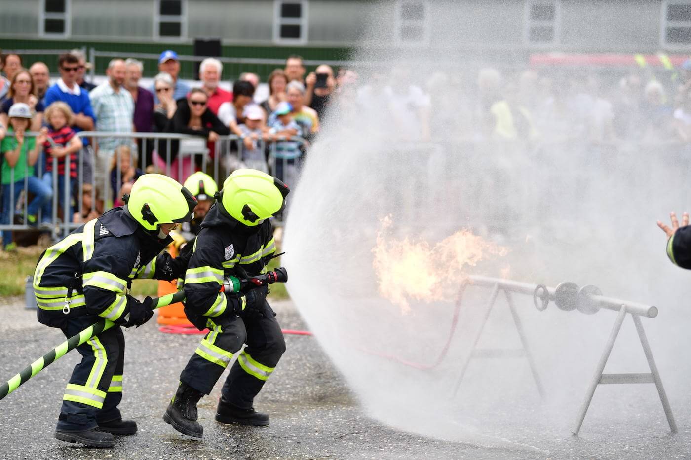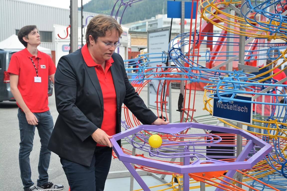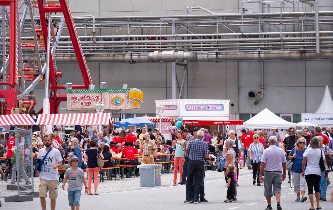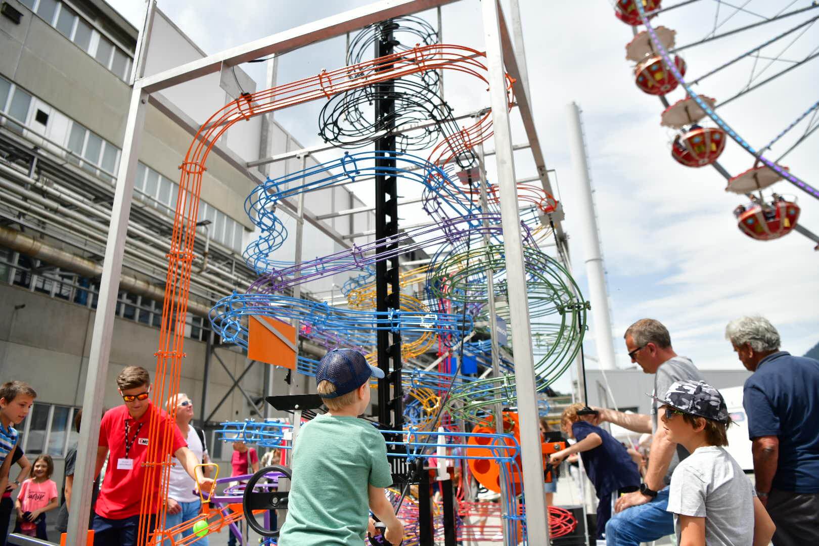 Dabei gab es durchaus auch viel zu erleben: Die werkeigene Feuerwehr präsentierte nicht nur ihre hochmodernen Löschfahrzeuge und Ausrüstungen, sondern zeigten ihr Können gleich in einer eindrücklichen Feuerwehrshow. Die sympathische Hundeshow zog nicht nur «Hündeler» in ihren Bann und der «Mungga-Trail» (die gigantische Kugelbahn mit über 120 Metern Länge und unzähligen Kurven, Loopings und Hebevorrichtungen – von EMS-Lernenden eigens für diesen Tag entwickelt) faszinierte nicht nur die vielen Kinder. Anziehungspunkte waren auch das 33 Meter hohe Nostalgieriesenrad mit Blick über den Werkplatz und die kurzweilige Rundfahrt durch das ganze EMS-Werk.