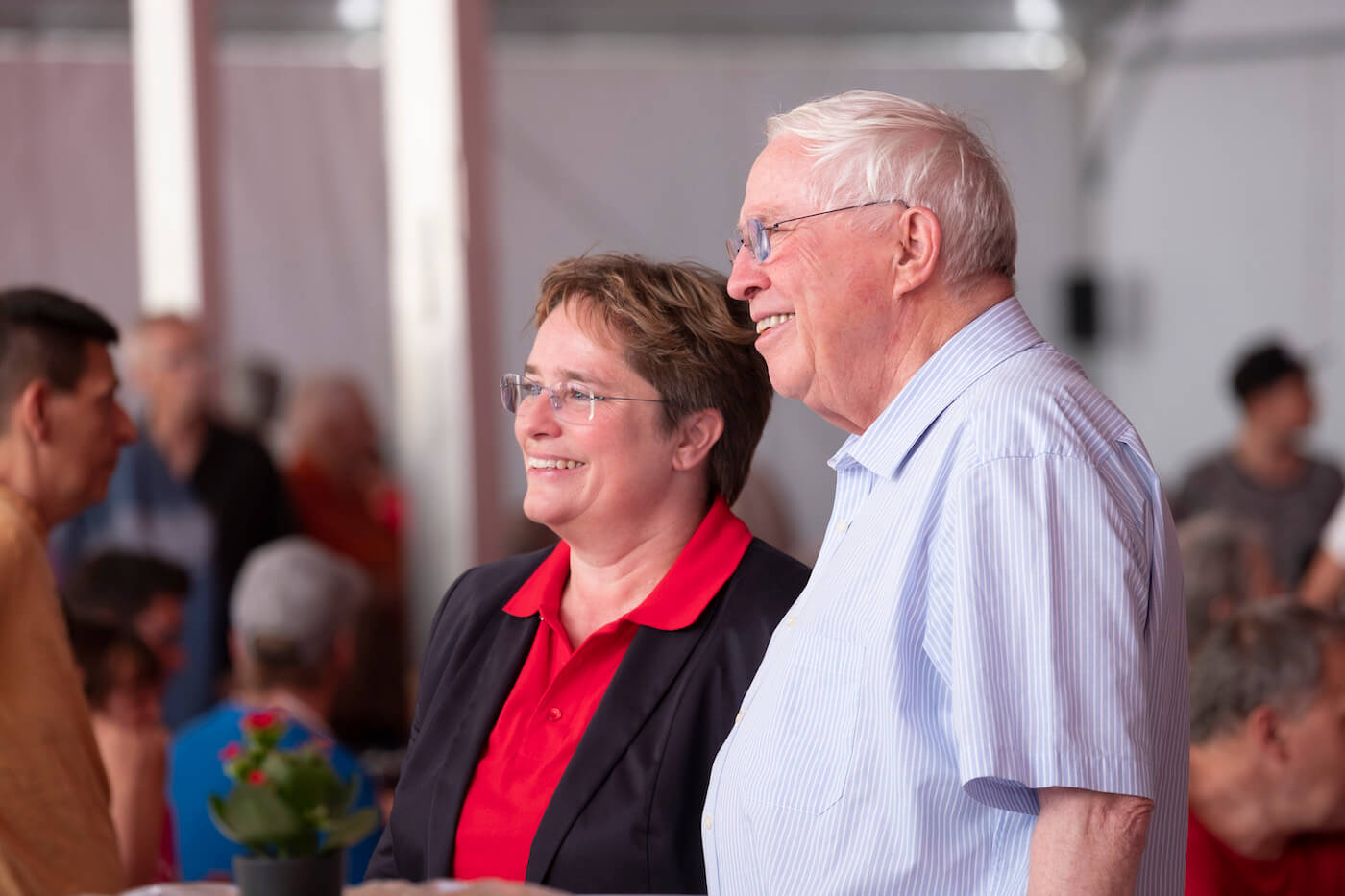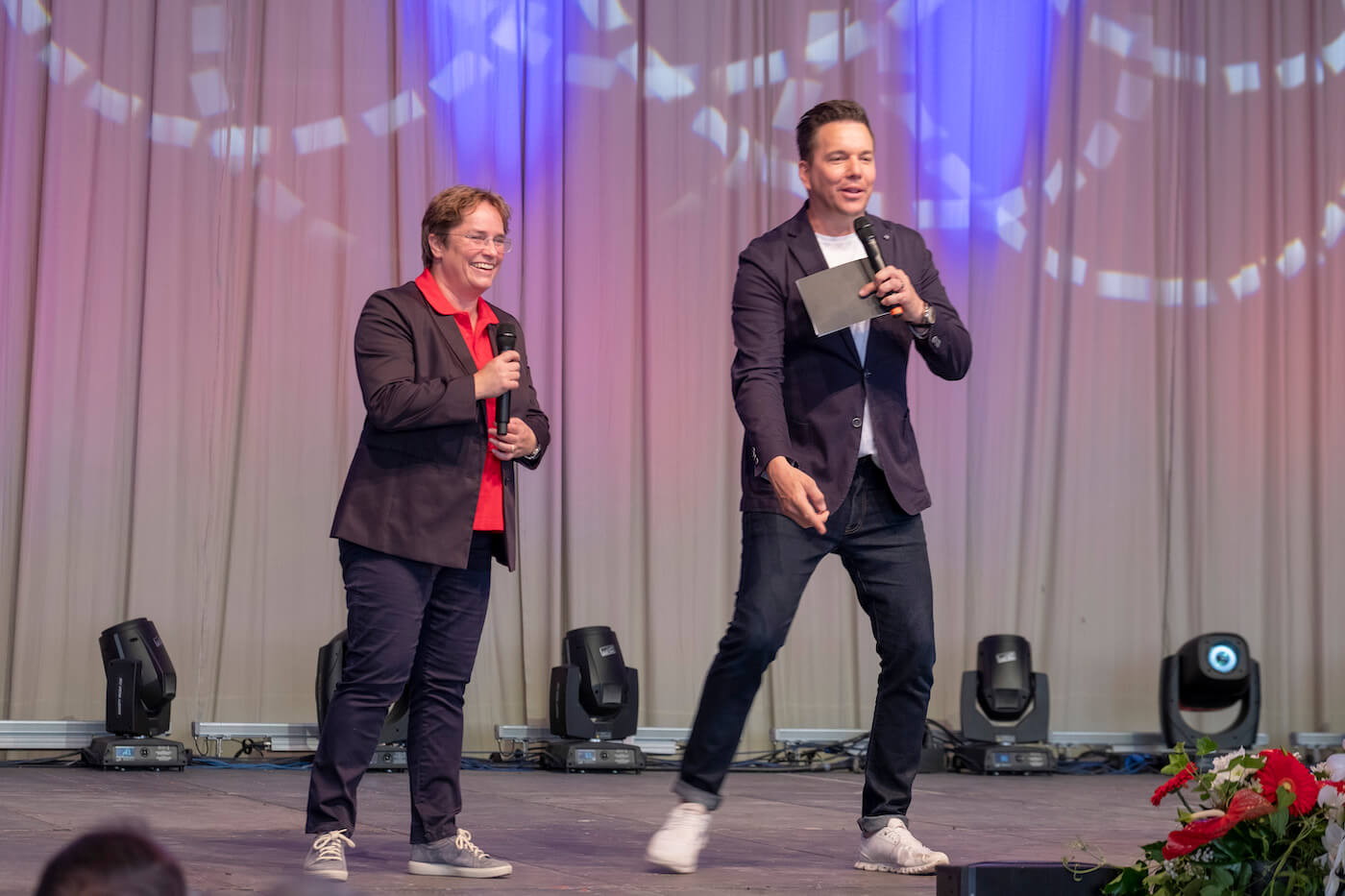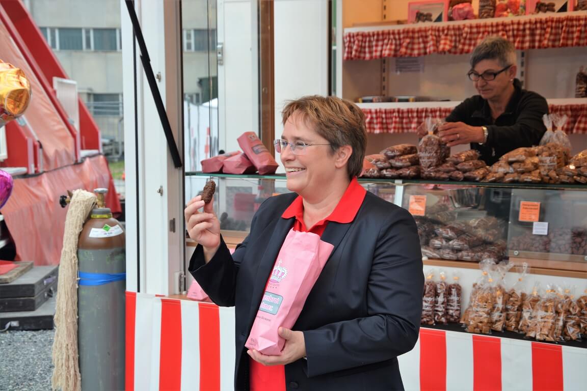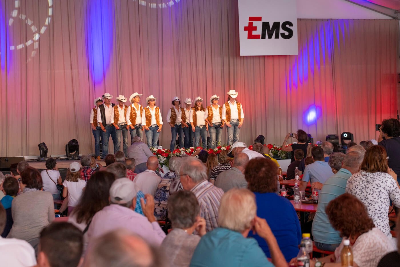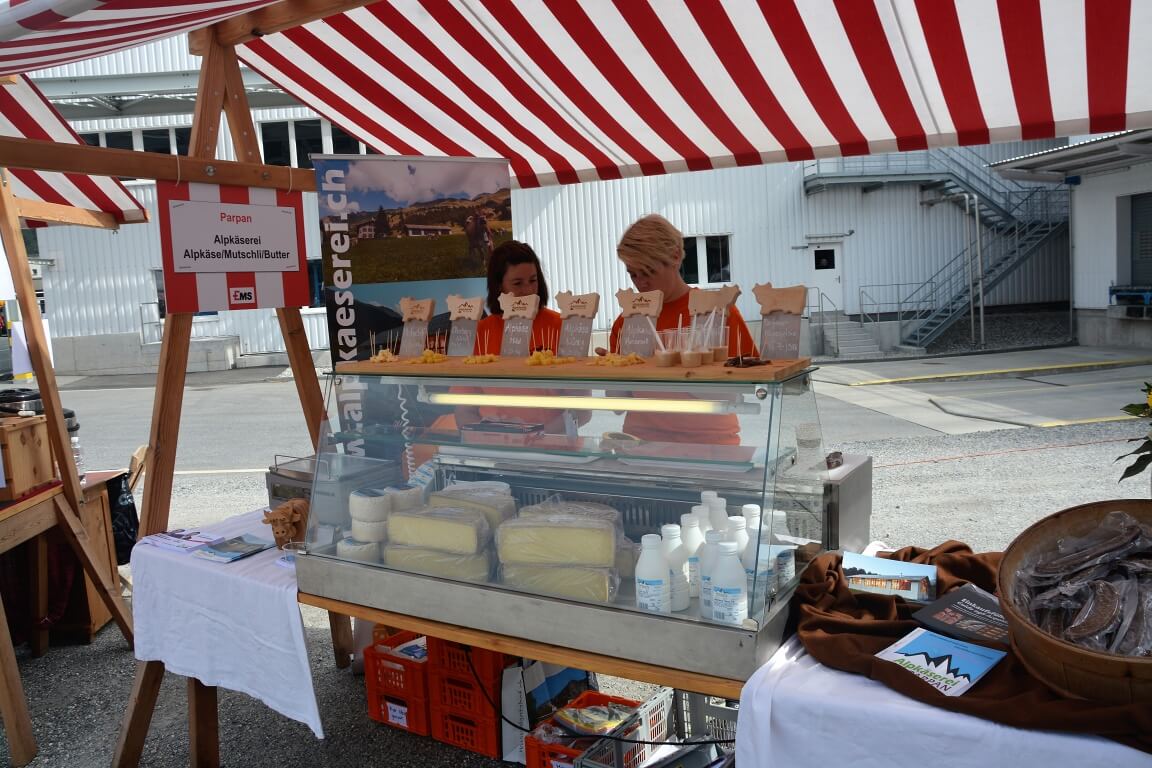 Nach dem Motto «aus der Region für die Region» wurde den Besuchern schliesslich auf dem grossen Festplatz vielfältige Unterhaltung aus Graubünden geboten: Im Festzelt heizte die 15-jährige Kübliserin Vanessa T. mit ihrer Power-Stimme den gut gelaunten Festbesuchern ein. Die Trachtengruppe Ilanz und Umgebung liess mit ihren farbenfrohen Trachten und lüpfigen Volkstänzen ein Stück echte Bündner Tradition aufleben. Estis Linedancers aus der Lenzerheide und die Steelband steel4ever aus Davos erweiterten das musikalische Spektrum und sorgten ihrerseits für Stimmung. Auch die Prominenz fehlte nicht: Die höchste Bündnerin, Standespräsidentin Tina Gartmann-Albin, Regierungspräsident Jon Domenic Parolini und Regierungsrat Mario Cavigelli sowie der Domat/Emser Gemeindepräsident Erich Kohler massen sich in einem freundschaftlichen Gewichtschätz-Wettbewerb mit Alt- Bundesrat und EMS-Ehrenpatron Christoph Blocher, EMS-Verwaltungsratspräsident Ulf Berg und mit der Bündner Nationalrätin und EMS-Chefin Magdalena Martullo. Mit Witz und viel Charme führten die beiden bekannten Moderatoren Sven Epiney und Annina Campell den ganzen Tag durch das reichhaltige Programm.