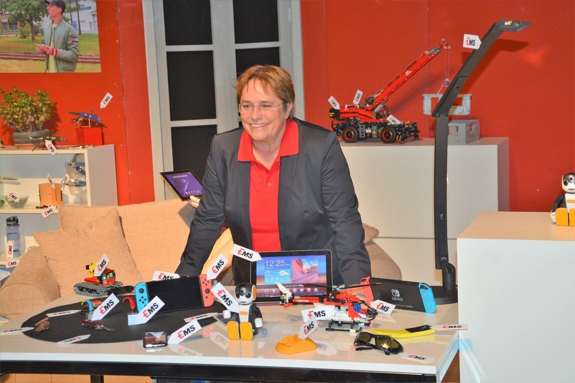 Gespannt ging es dann auf den rund eineinhalbstündigen Rundgang durch die Werksanlagen: Nach einer kurzen Zeitreise durch die mittlerweile 83-jährige Geschichte von EMS bestaunten die Besucher auf 1’500 Quadratmetern über 3’000 hochinnovative Anwendungen aus EMS-Spezialkunststoffen – von hochtemperaturbeständigen Automotorbestandteilen, über ultraleichte Fahrradkomponenten bis zum Spielkameraden und Multimedia-Roboter «Robi». Überall steckt Kunststoff aus Graubünden drin! Weiter ging es durch das hochmoderne EMSer Entwicklungszentrum, vorbei an den Rohstoffentladungsstationen, entlang unzähliger Rohrleitungen, durch weitläufige Produktions- und Verpackungsanlagen bis zum weltweit dritthöchsten Hochregallager, von wo aus die EMS-Spezialkunststoffe in alle Welt verschickt werden.