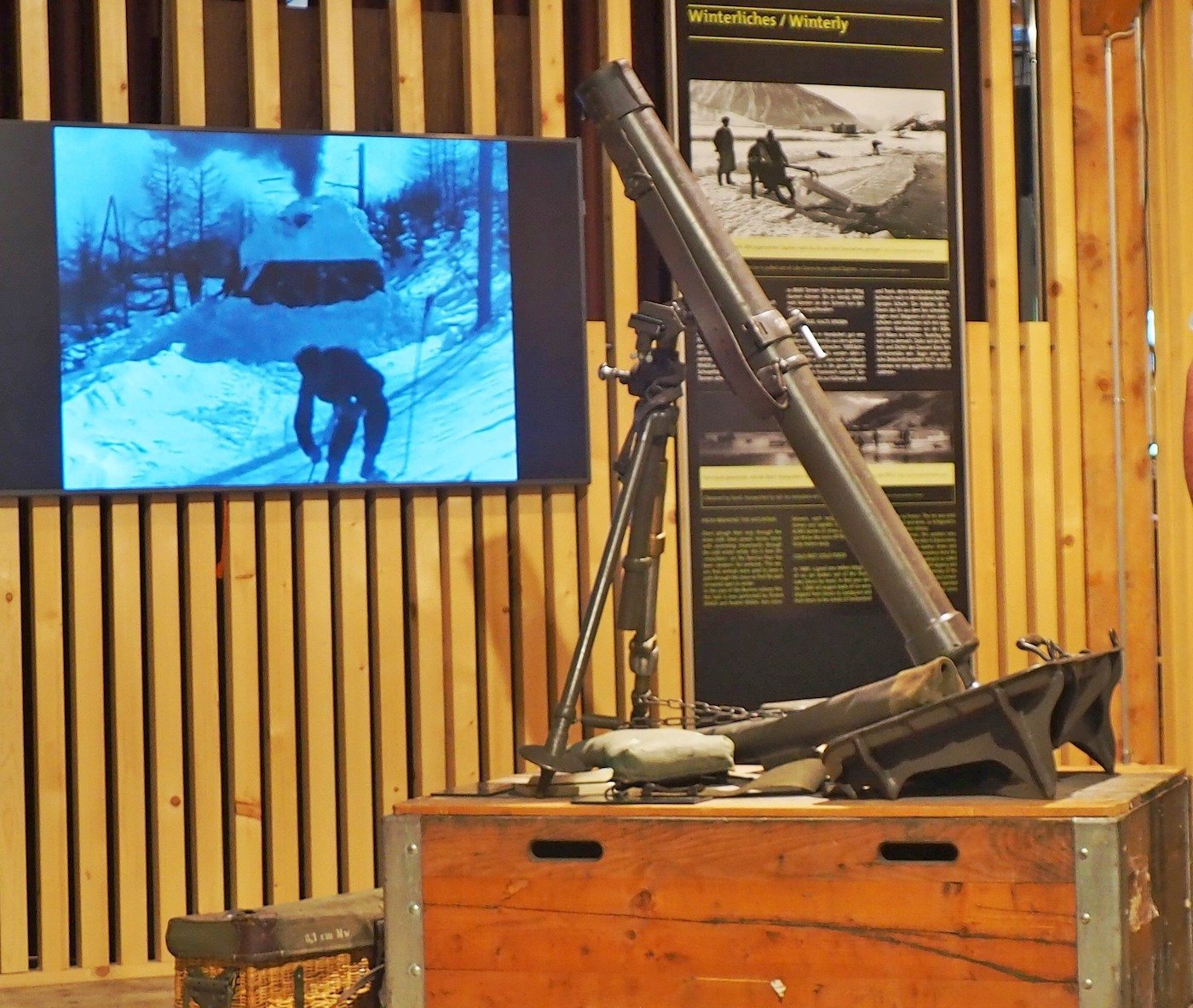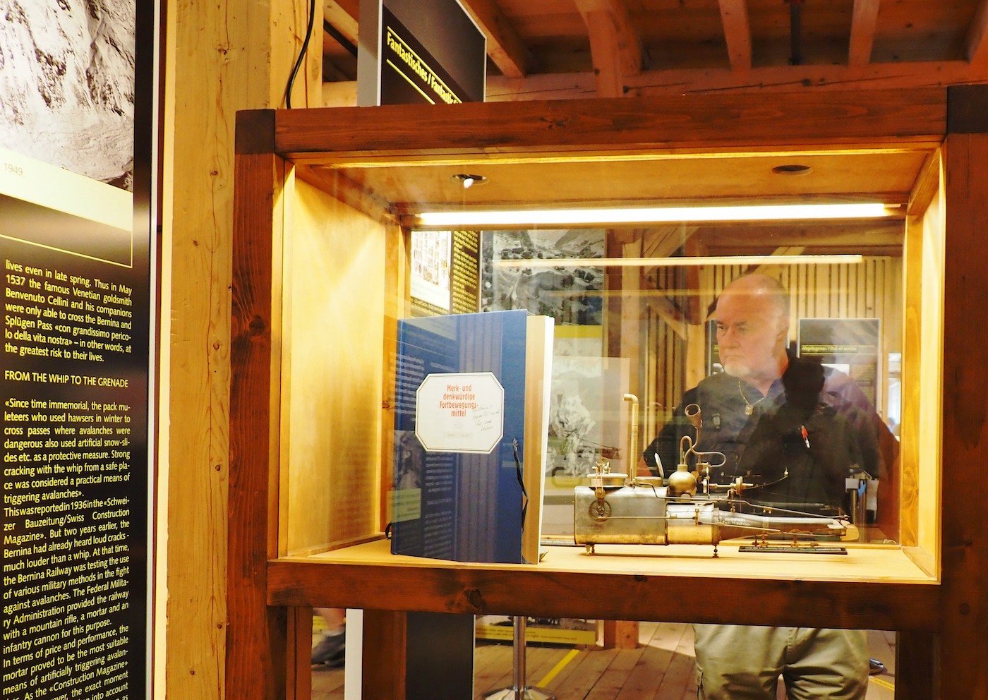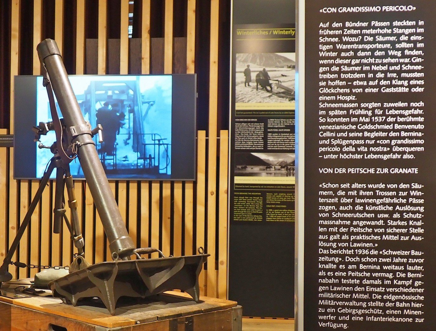 Mitten in der Sonderausstellung findet sich auch ein grosser Minenwerfer der Schweizer Armee. Mit diesem Geschütz löste man früher etwa am Berninapass künstlich Lawinen aus. Wie das vor sich ging, zeigt das Bahnmuseum Albula auch anhand von historischen Filmsequenzen. Zum Thema «Winterliches» gehört zudem die Eisgewinnung am Davoser See: Als es noch keine Kühlschränke gab, wurde das Eis von Davos tonnenweise per Bahn zu Restaurants in der ganzen Schweiz oder nach Frankreich transportiert.