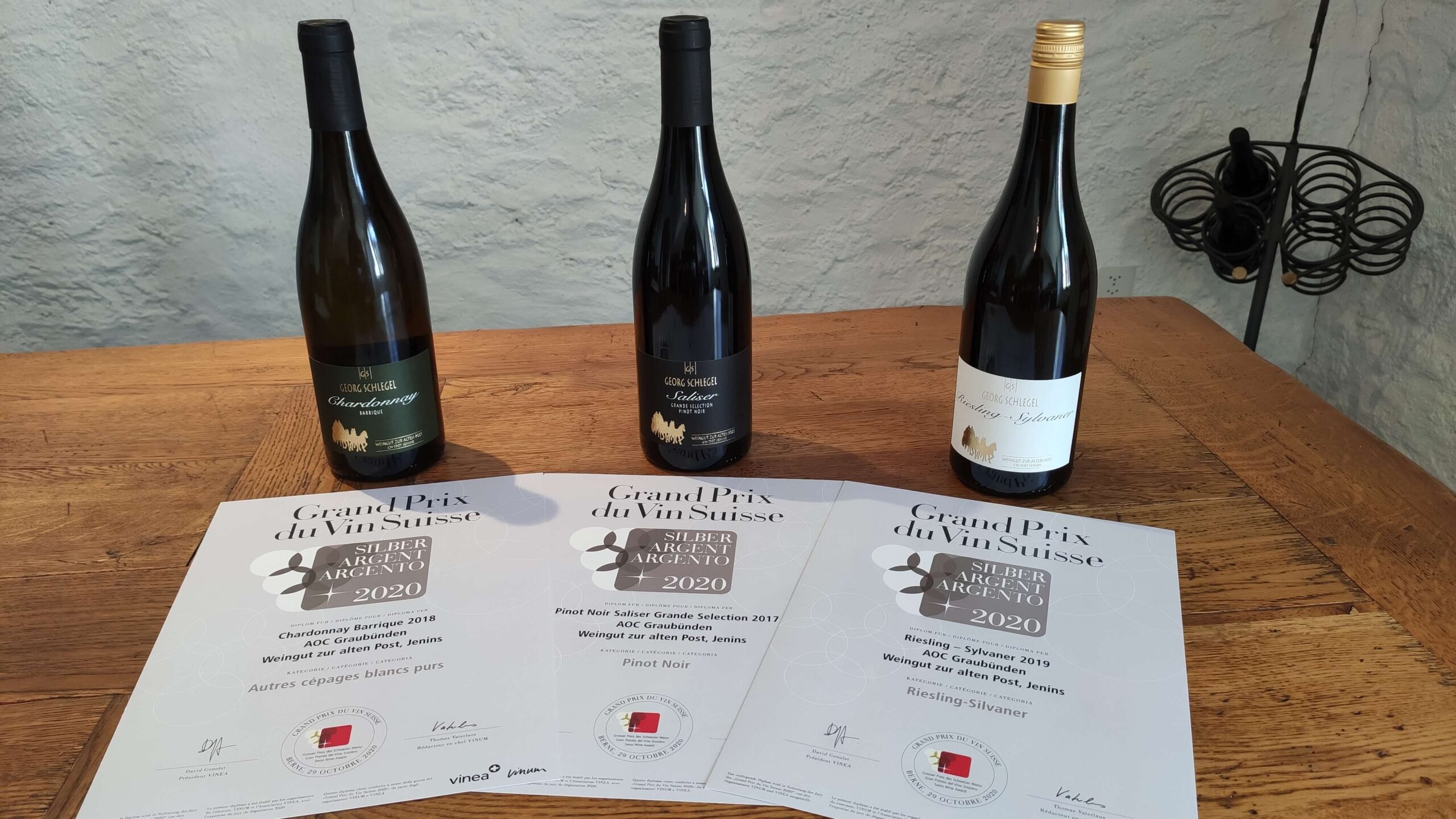 Silber für den Chardonnay Barrique 2018, Silber für den Pinot Noir Saliser Grande Selection 2017 und Silber für den Riesling Sylvaner 2019: Auch beim Grand Prix du Vin Suisse räumte Georg Schlegel ab. An der Referenzprämierung für Schweizer Weine reichen 550 Winzer jedes Jahr etwa 3000 Weine ein, die dann von 170 erfahrenen Degustatoren bewertet werden.