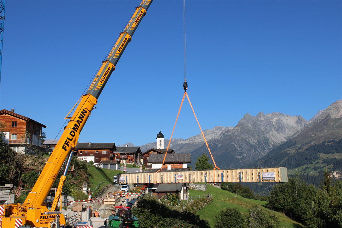 Für die Dauer der Bauzeit konnte keine Hilfsbrücke erreichtet werden, und komfortable Umfahrungsmöglichkeiten waren kaum vorhanden. Um die Einschränkungen für den Verkehr möglichst gering zu halten, wurden die beiden je 25 Tonnen schweren und über 27 Meter langen Holzträger vorgefertigt und schliesslich vor Ort millimetergenau eingebaut. Dieses Vorgehen sorgte für hohe Qualität und eine Strassensperre von nur acht Wochen, vom Abbruch der alten bis zur Inbetriebnahme der neuen Brücke. Der spektakuläre Transport der vorgefertigten Holzträger durch die engen Strassen im Bündner Oberland stellte eine besondere Herausforderung dar.