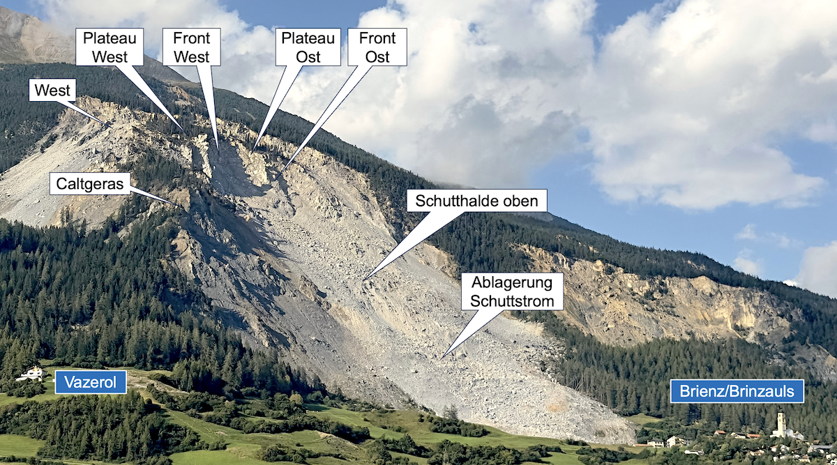 Die «Schutthalde oben» bewegt sich schleichend langsam ins Tal. Zwar kommt mehr und mehr des Schutts aus früheren Felsstürzen unten in eine flachere Zone und bremst ab, aber von oben fallen immer wieder neue Felsblöcke darauf und halten die Bewegung auf Laufen. Sollte es zu einem grossen Felssturz kommen, könnte sich die ganze Menge lösen und als Steinlawine das Dorf treffen.
