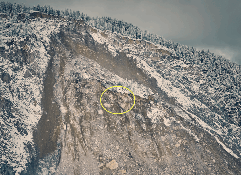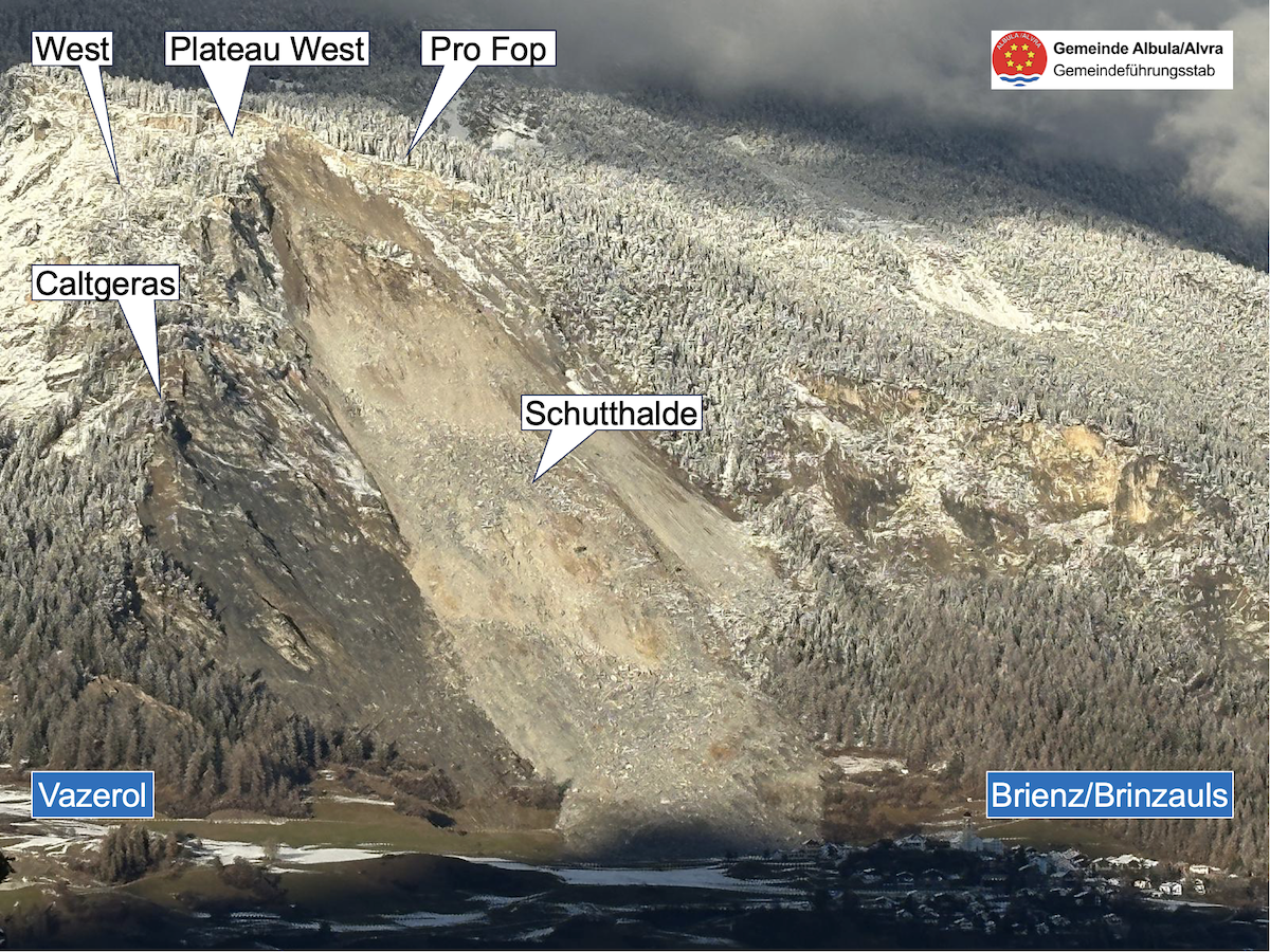 Im Verlaufe des Novembers hatte sich das «Plateau Ost» hoch über dem Dorf immer stärker beschleunigt. Es ging vergangene Woche in einem mehrtägigen Abbruchereignis ab. Aus der instabil gewordenen Felsmasse gingen über 100 Felsstürze auf die darunterliegende «Schutthalde oben» nieder. Die zunehmende Auflast der Felsstürze beschleunigte die «Schutthalde oben» stark. Ein grosser Abbruch von rund 200’000 bis 300’000 Kubikmetern Fels auf die immer schneller werdende «Schutthalde oben» konnte vorerst nicht ausgeschlossen werden.