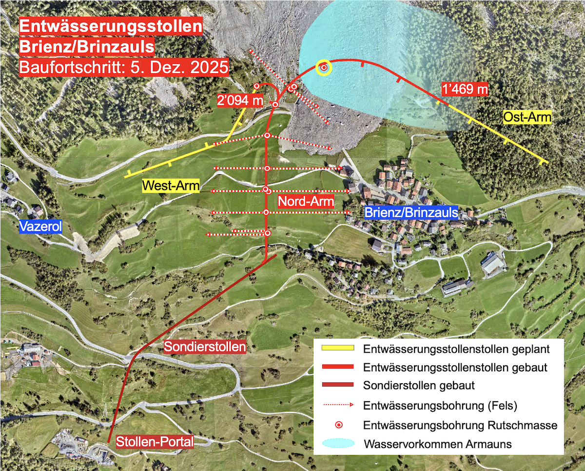 In der vergangenen Woche konnte das Wasservorkommen Armauns nördlich des Dorfes erstmals von unten aus dem Entwässerungsstollen angebohrt werden. Die Bohrung erfolgte aus der Nische 12 im Ostarm (im Bild gelb eingekreist). Nach dem Anbohren der Rutschmasse strömten bis zu 1’500 Liter Wasser pro Minute in den Entwässerungsstollen. Diese grossen Wassermengen waren von den Geologen so erwartet worden. Sie sind ein weiterer Erfolg im Bau des Entwässerungsstollens.