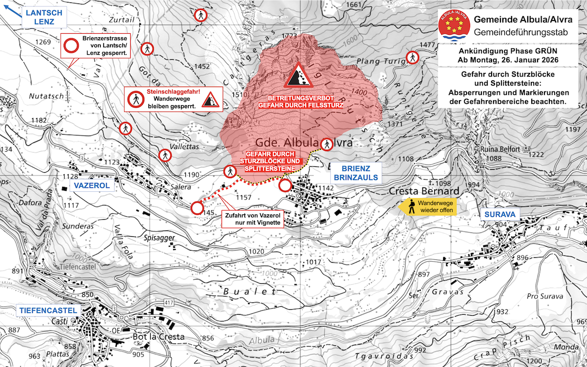 Der Gemeindeführungsstab Albula/Alvra freut sich sehr, dass er das seit dem 17. November 2024 geltende Betretungsverbot für das Gebiet um Brienz/Brinzauls wieder aufheben kann. Die akute Gefährdung aus dem Felssturzgebiet hoch über dem Dorf hat sich seit dem Schuttstrom von Ende November 2025 so stark reduziert, dass ein dauernder Aufenthalt im Dorf wieder sicher ist, wie der Gemeindeführungsstab Albula/Alvra am Donnerstag mitteilte.