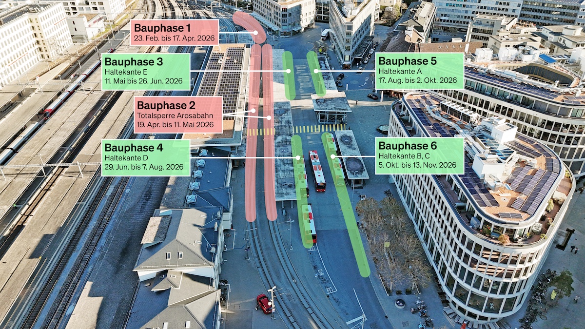 Im Rahmen eines Gemeinschaftsprojekts der RhB und der Stadt Chur werden die Perrons der Arosabahn und die Haltekanten am Busbahnhof ab dem 23. Februar 2026 behindertengerecht umgebaut. Die Bauarbeiten auf dem gesamten Bahnhofplatz werden in sechs Bauetappen umgesetzt. In einer ersten Bauphase wird das Perron im östlichen Teil – Höhe Raiffeisenbank – erhöht. Diese Arbeiten dauern bis Mitte April.